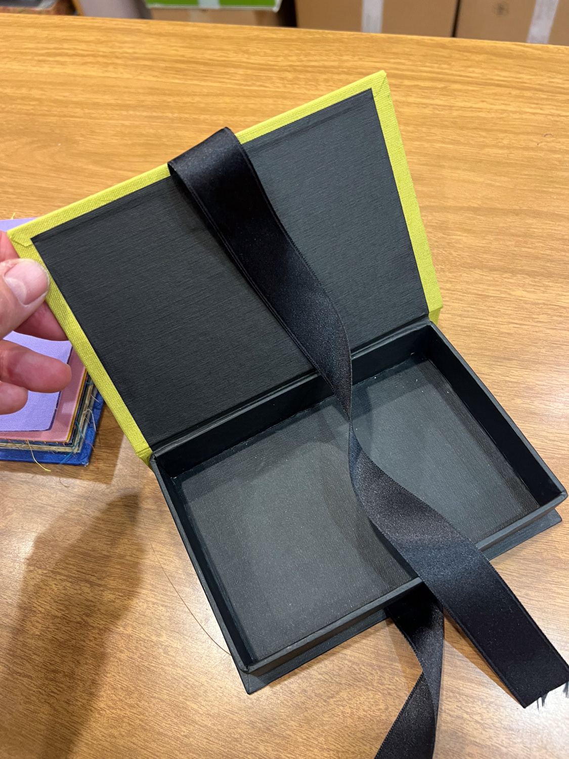 Scatola fatta a mano 19x25 cm in cartone pressato acid-free con tela naturale in diversi colori, nastro per estrarre le foto, incisione in bassorilievo in colore bianco o nero ( contiene fino a 120 fotografie 18x24)